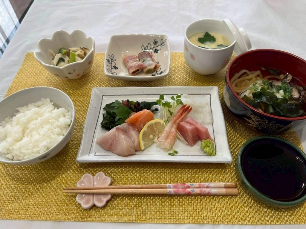 今日の昼食は刺身定食です🐡💗新鮮なお刺身を美味しそうに笑顔で召し上がられていました😊