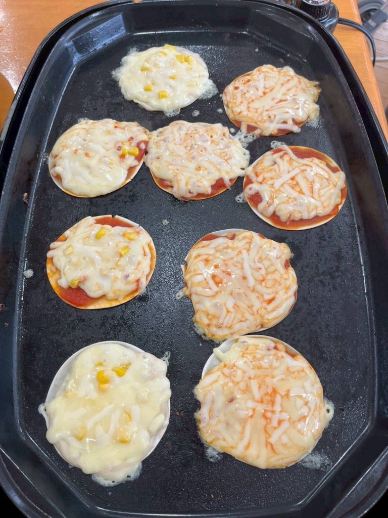 今回のおやつレクは餃子の皮でピザを作ってみました😊